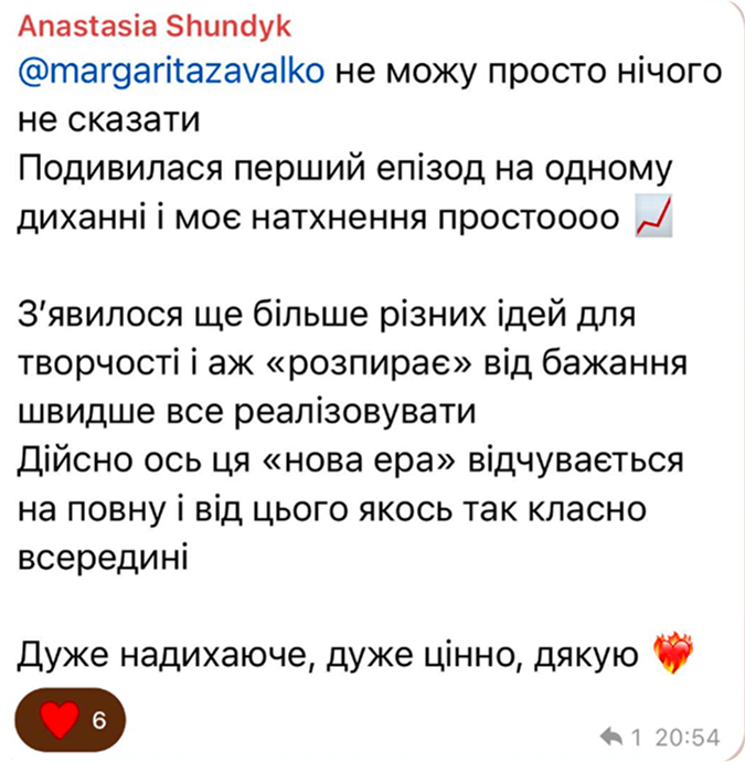 Маргарита – успішна реалізована креаторка, яка створює не лише для власної творчості, але й на замовлення відомих комерційних та особистих брендів: Сільпо, Comfy, Uklon, Fizi, Samsung, Кураж, MOLODO та ін. У своїх відеороботах на замовлення вона відповідає за весь процес: від ідеї до фінальної презентації клієнту, а саме зараз знімає свою першу короткометражку, тому має найцінніше – багатий реальний досвід. Уже понад 3 роки навчає зйомки інших креаторів. Її навчальні продукти сумарно пройшло понад 1400 людей.